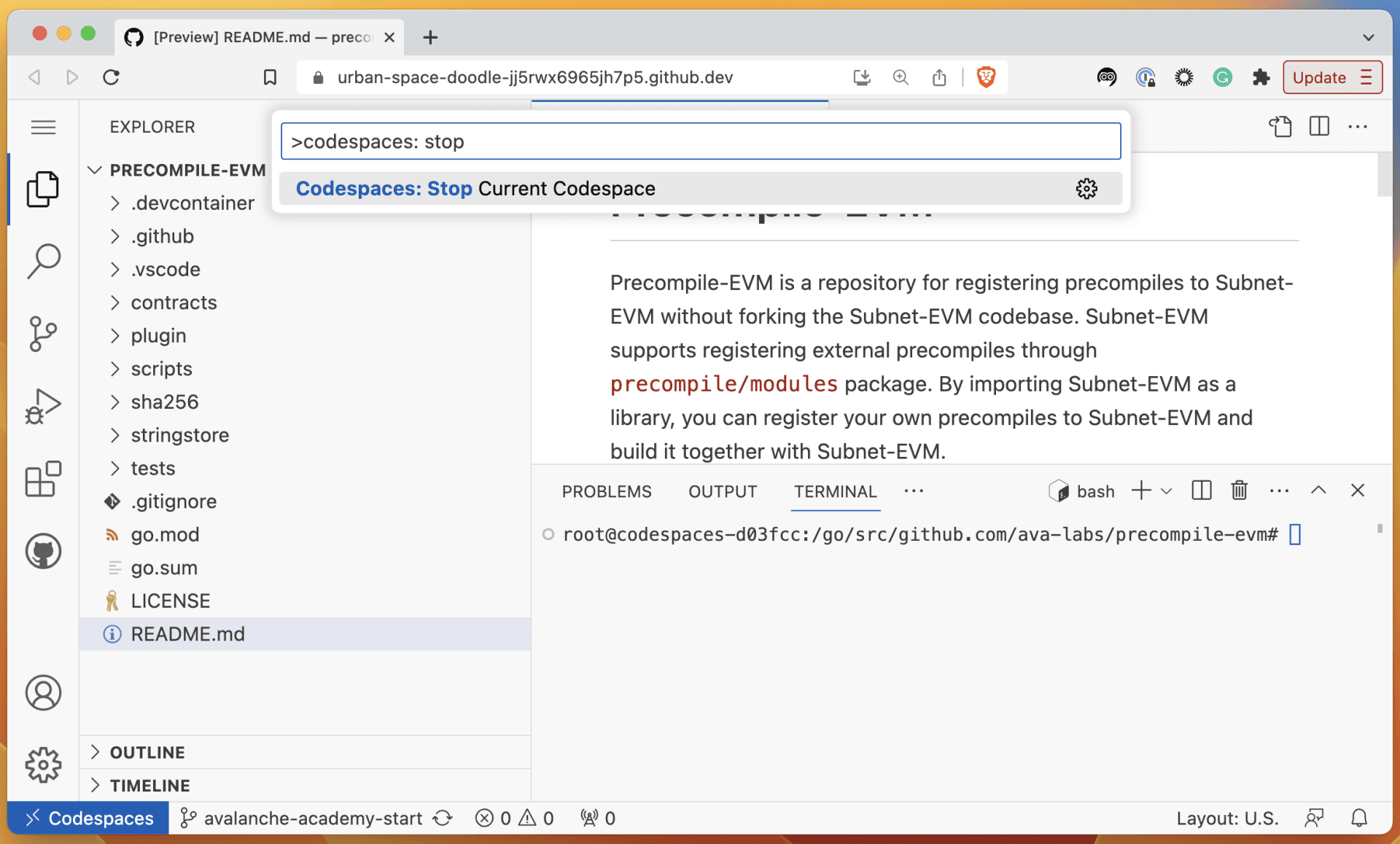 Open a Codespace on the Precompile-EVM Repository on the avalanche-academy-start branch by clicking the button below: