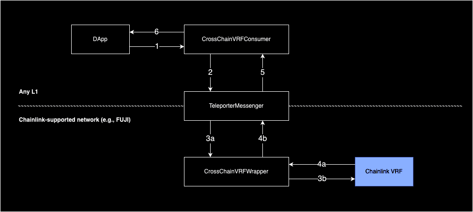 1. On the Chainlink-supported network, the TeleporterMessenger receives the cross-chain message sent by the CrossChainVRFConsumer. It passes the message to the CrossChainVRFWrapper, which is authorized to handle VRF requests.